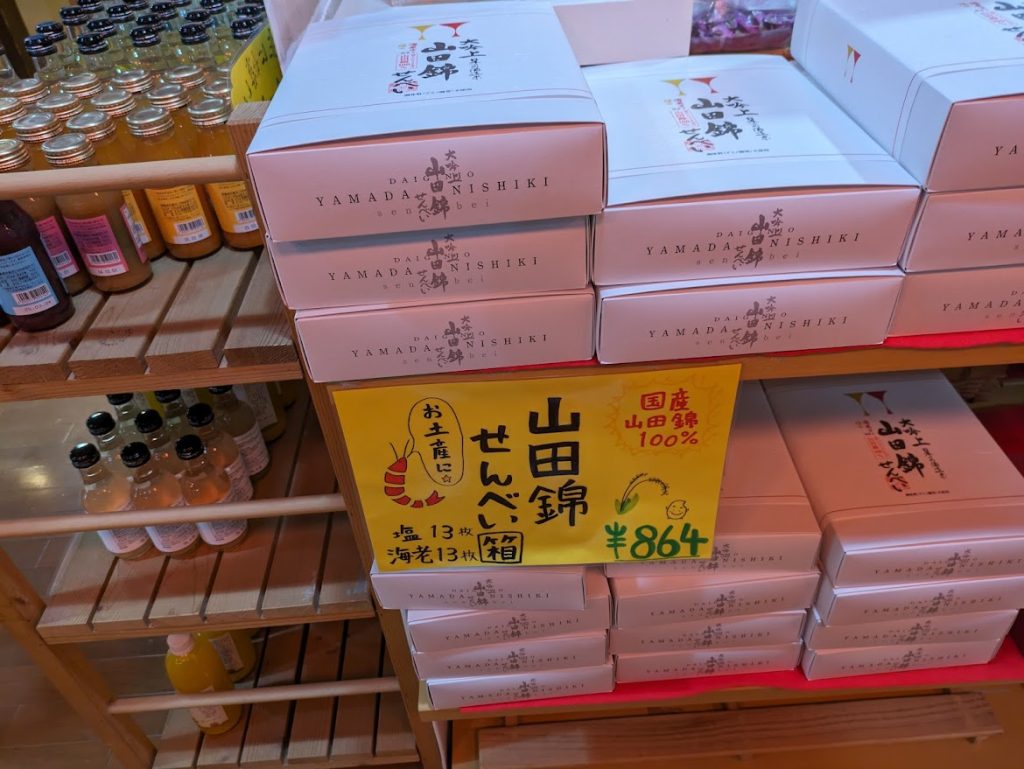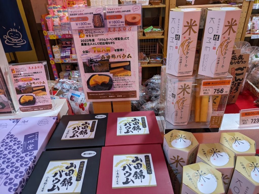 山田錦を使ったケーキやバウムクーヘンに煎餅などあり、どれもこだわりが感じられる商品説明が添えらていた。